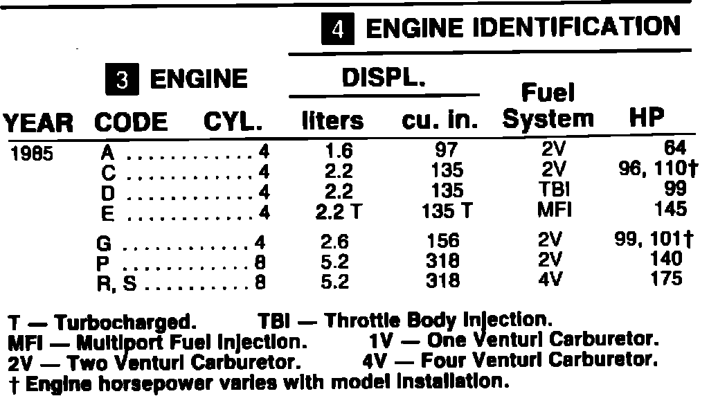 4 ENGINE IDENTIFICATION: On the line where the engine code appears, read to the right to identify the engine.