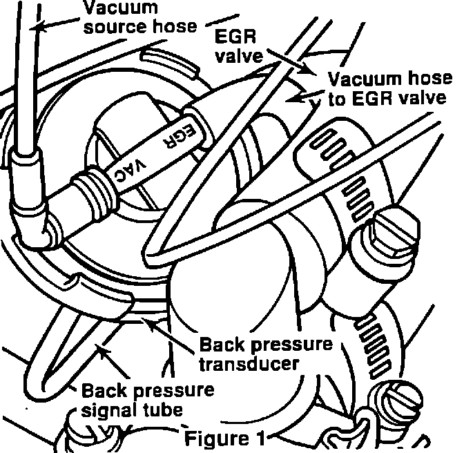 1. Disconnect vacuum source hose, backpressure signal tube and vacuum hose to EGR valve from the EGR backpressure transducer (Figure 1).