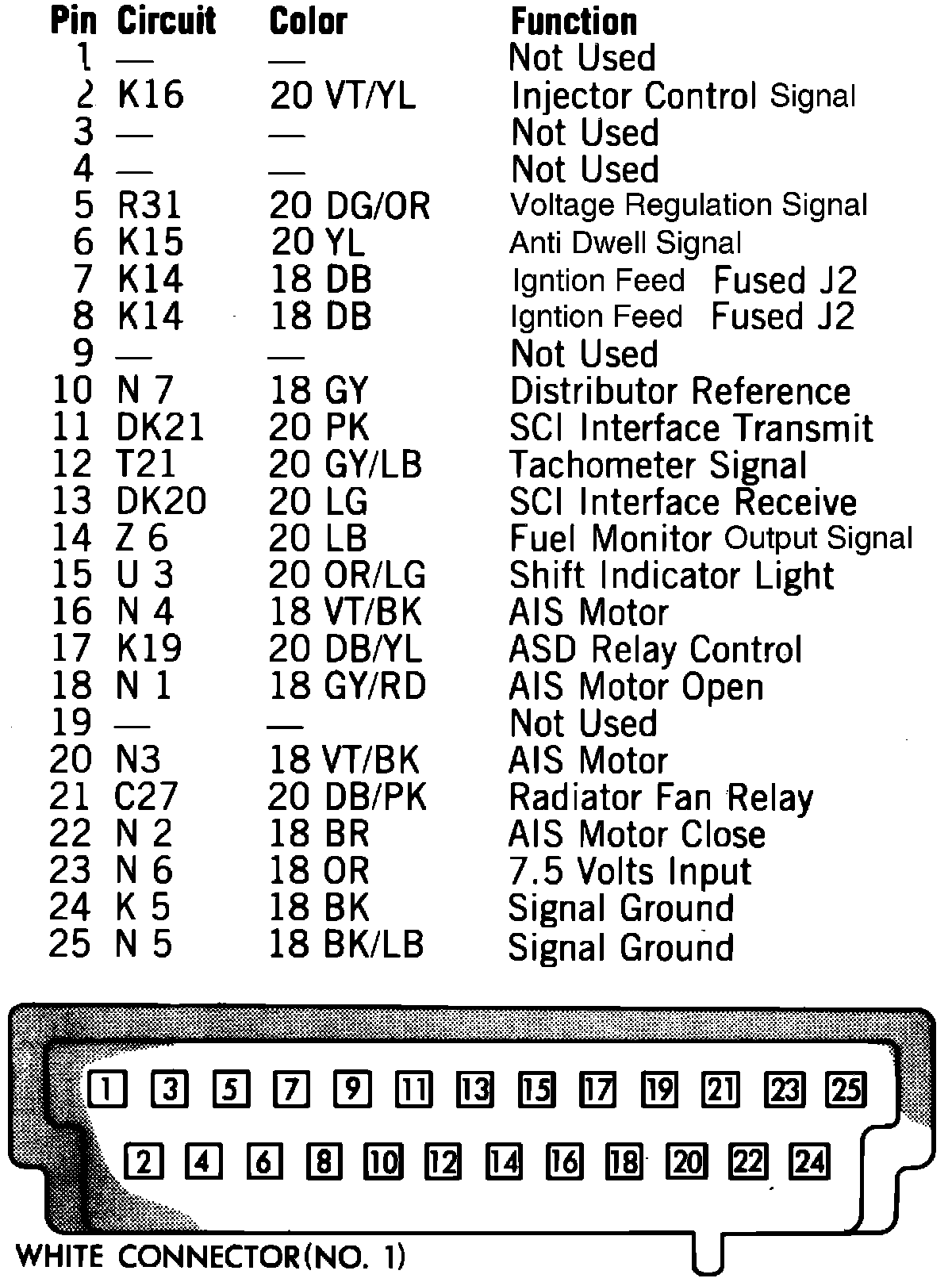 Fig. 7 Logic module white connector terminal identification. 1986 models: