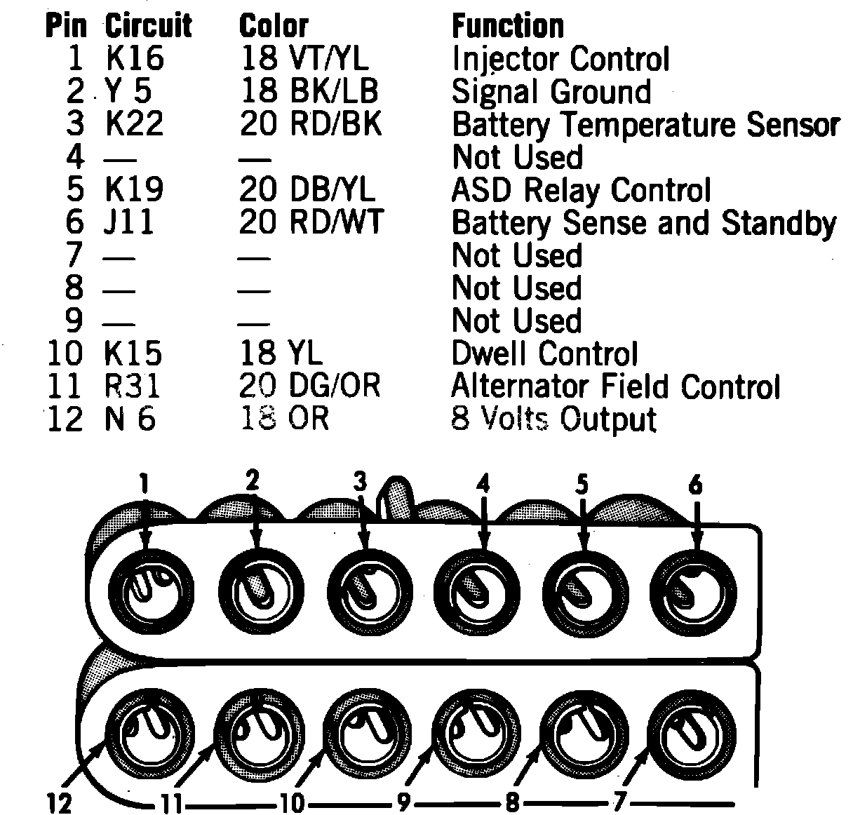 Fig. 13 Power module 12 pin connector terminal identification. 1986 models: