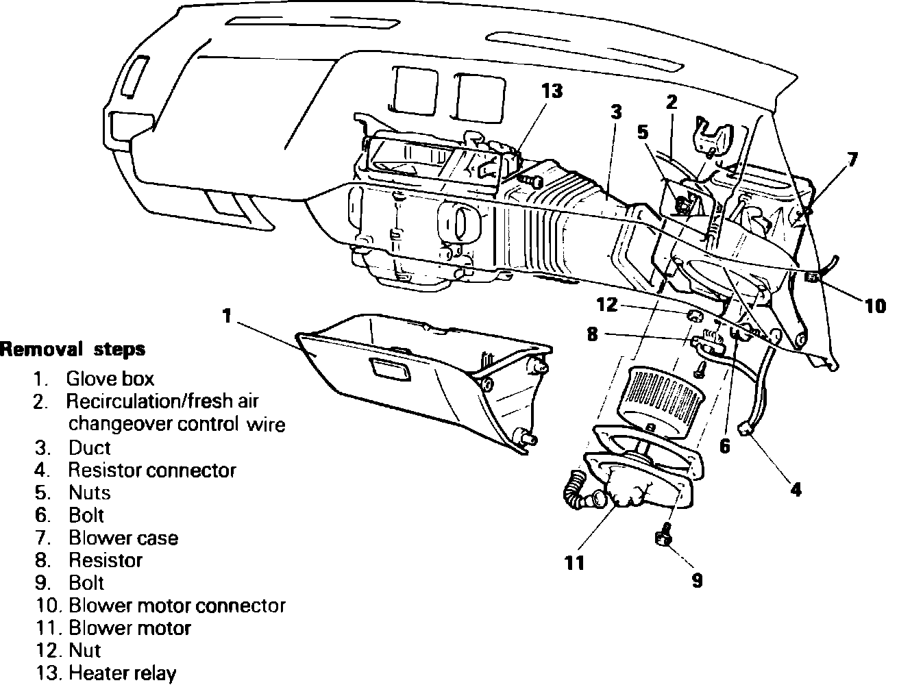4. Remove glove compartment, ashtray lap heater duct or steering column lower trim and parcel tray (if equipped).
