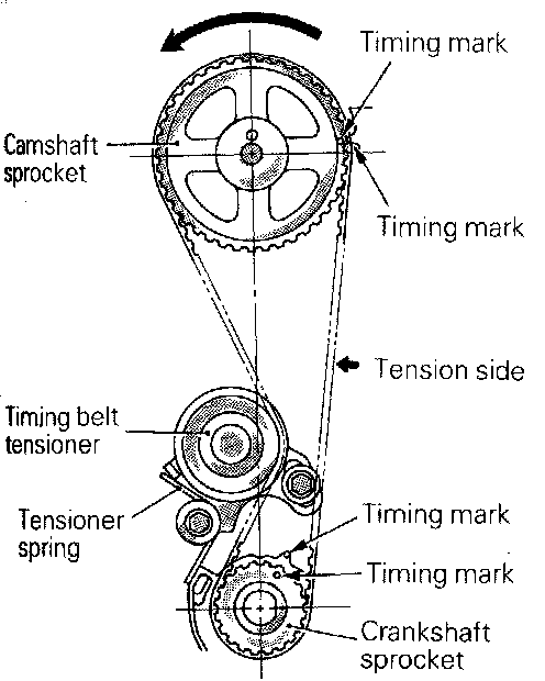 10. Remove timing belt. If the timing belt is to be reused, place an arrow mark indicating turning direction (direction of engine rotation) to ensure that the belt is installed in the same direction as before.