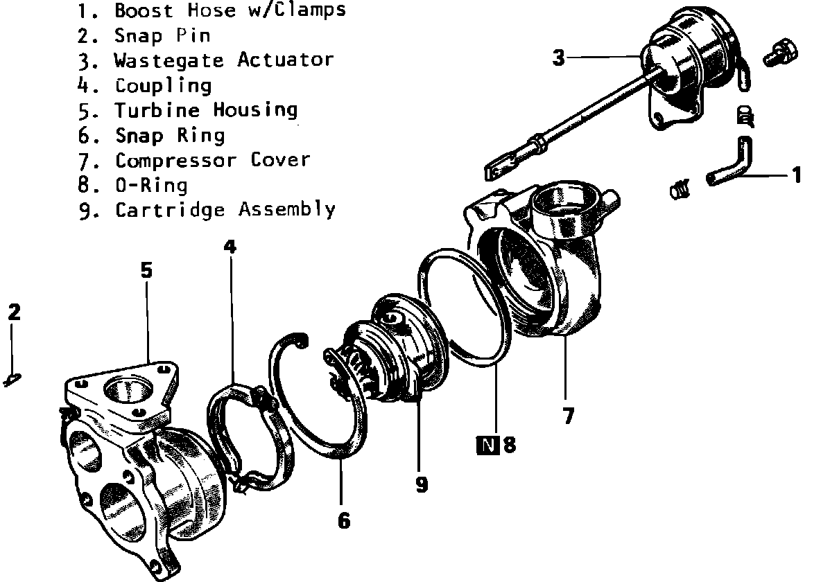 Fig. 3 Exploded view of turbocharger assembly. 1987-88 Models w/1600cc engine: