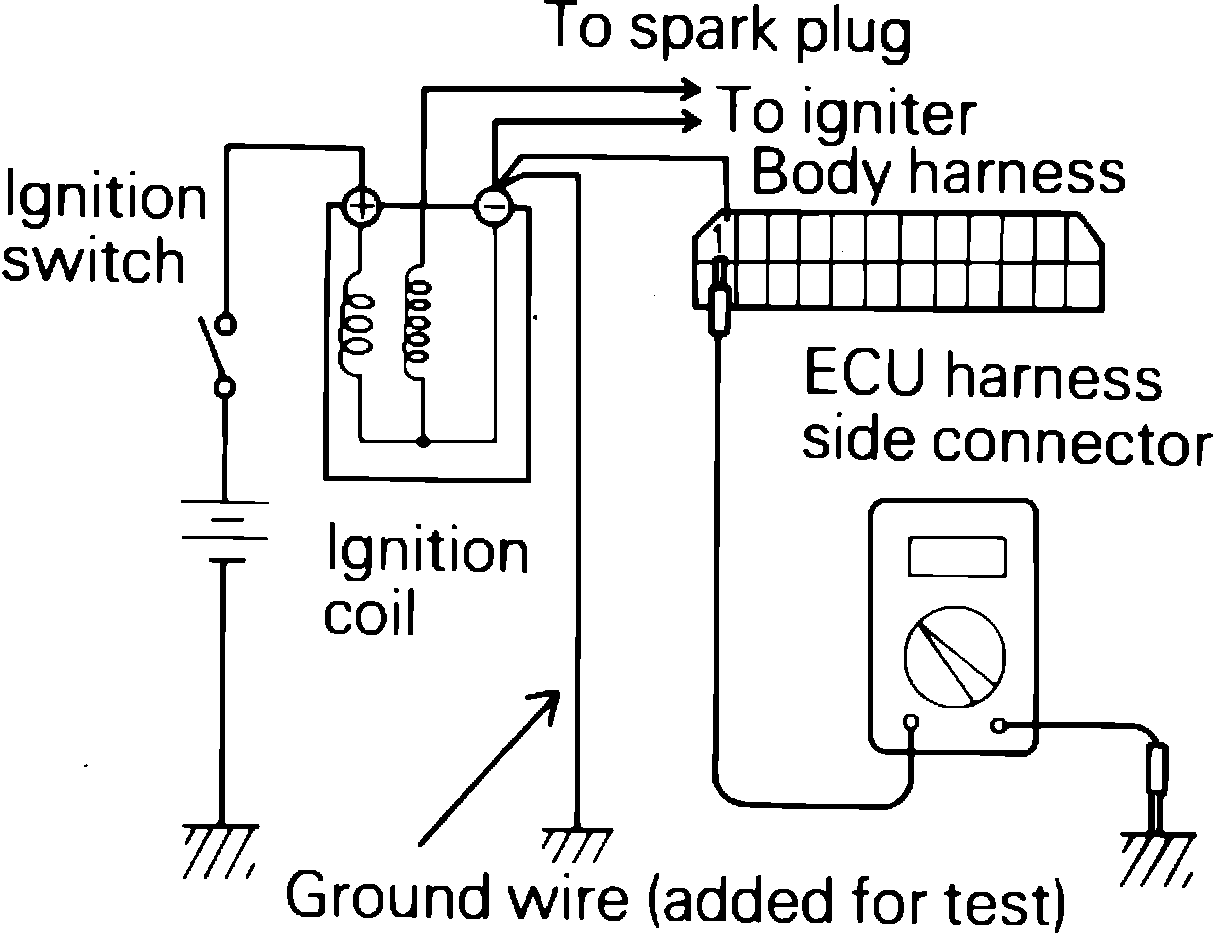 Check that continuity exists between ignition coil negative terminal and ECU terminal 1,
