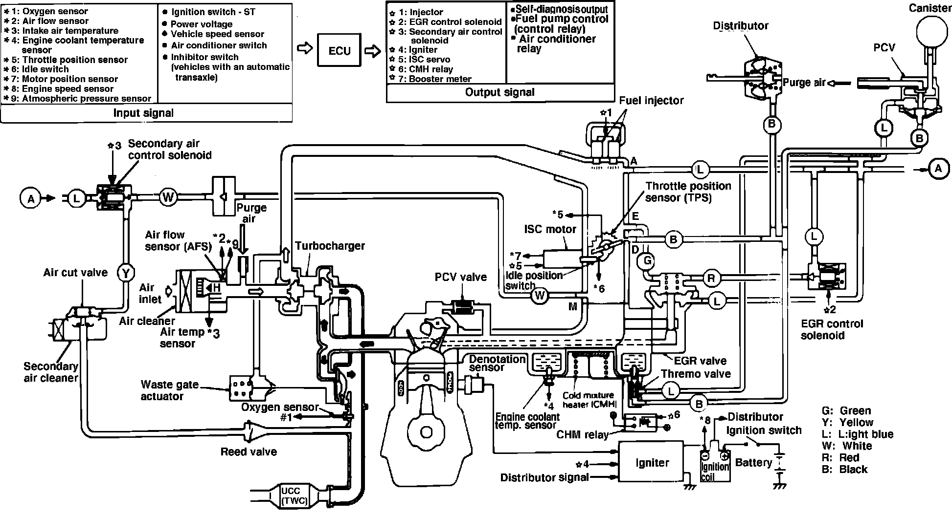 The Electronically Controlled Injection System (ECI), Fig. 2 used on 1600cc and 2600cc turbocharged engines, is a computer controlled, dual point fuel injection system which provides a precise fuel/air ratio under all driving conditions. The system utilizes a pre-programmed electronic control unit (ECU), to regulate ignition timing, idle speed, emission devices and fuel/air ratio. Various sensors and switches located throughout the engine compartment provide information to the ECU. This system also incorporates a self diagnosis function which monitors various parameters for proper operation.
