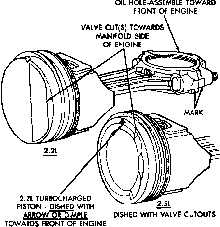 When installing piston and rod assembly, valve cut must face toward manifold side of engine, Fig. 34. Turbocharged engine pistons will have an arrow or dimple toward front of engine. Oil hole on connecting rod must face timing belt side of engine.