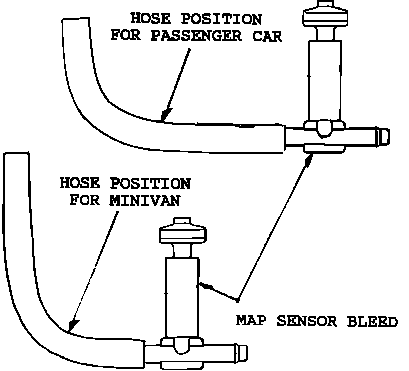 2. Install the MAP sensor bleed assembly (4669040) into the formed hose (4669109) supplied with the package. For passenger cars (except 1989 Omni/Horizon and all 1990-91 passenger cars) install the bleed assembly into the long leg of the molded hose. For minivans install the bleed assembly into the short leg of the molded hose (Figure 1).