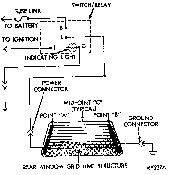 b. Rear window grid lines (all grid lines would have to be broken, or one of the feed wires not connected for the system to be inoperative.