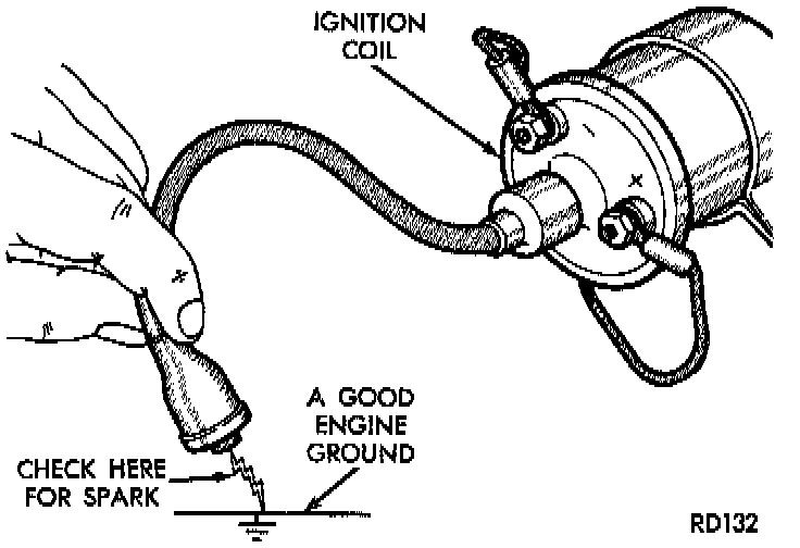 1. Remove coil secondary wire from distributor cap. Hold end of wire about 6mm (1/4-inch) away from a good engine ground. Have a helper crank the engine while you look for a spark at coil secondary wire.
