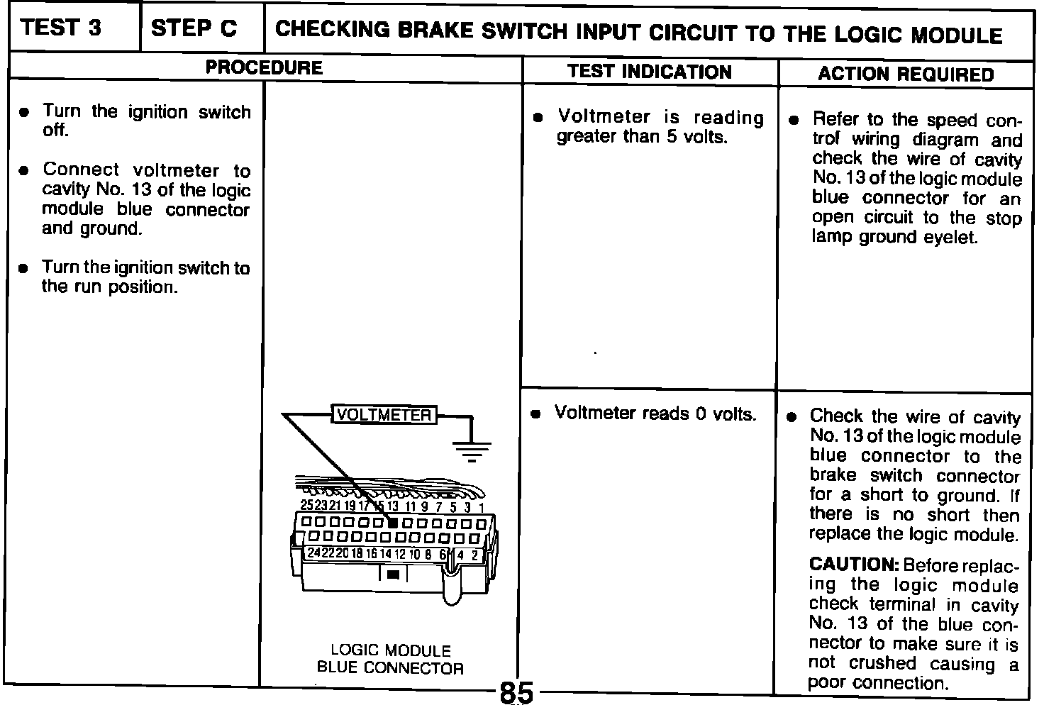 TEST 3 STEP C CHECKING BRAKE SWITCH INPUT CIRCUIT TO THE LOGIC MODULE