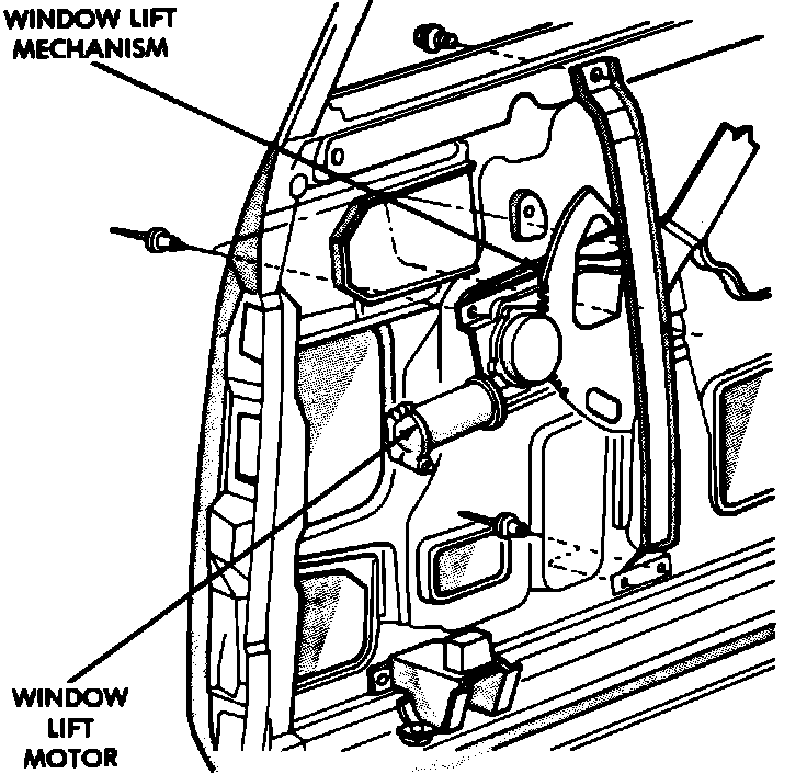 The window regulator is of a conventional sector gear design. The power window motor is attached to the window regulator. The window motor/regulator assembly is attached to the inner door panel of each door. Two door models that are equipped with rear power windows have a separate window motor/regulator assembly in the rear quarter panels.