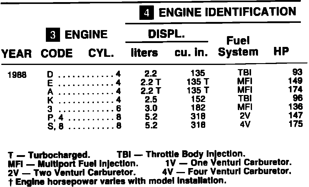 4 ENGINE IDENTIFICATION: On the line where the engine code appears, read to the right to identify the engine.