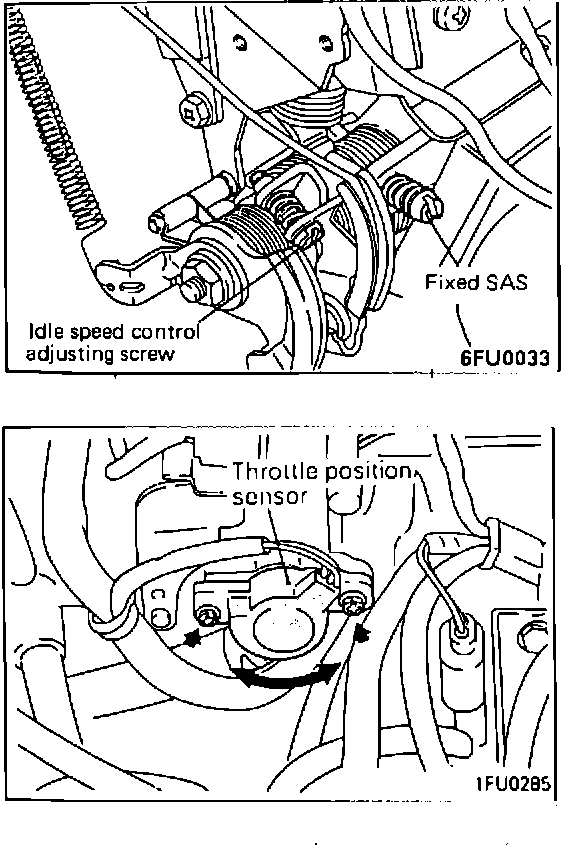 14. If it is out of specification, adjust by loosening the throttle position sensor mounting screws and rotating the throttle position sensor. After adjustment, tighten the screws firmly.