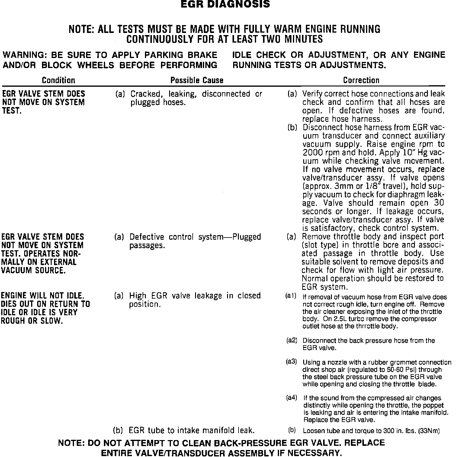 If control system is functioning properly, the valve and passages may be checked for exhaust gas flow. Slowly apply vacuum directly to the EGR valve with the engine warm and idling in neutral. Idle speed should drop 150 RPM or more. Engine speed should start to drop when vacuum reaches 2.0 to 3.5 inches Hg. This reduction in idle speed confirms that exhaust gas recirculation is taking place. If the speed change does not occur, or is less than that specified, exhaust deposits in the EGR valve or intake manifold EGR passages are indicated.