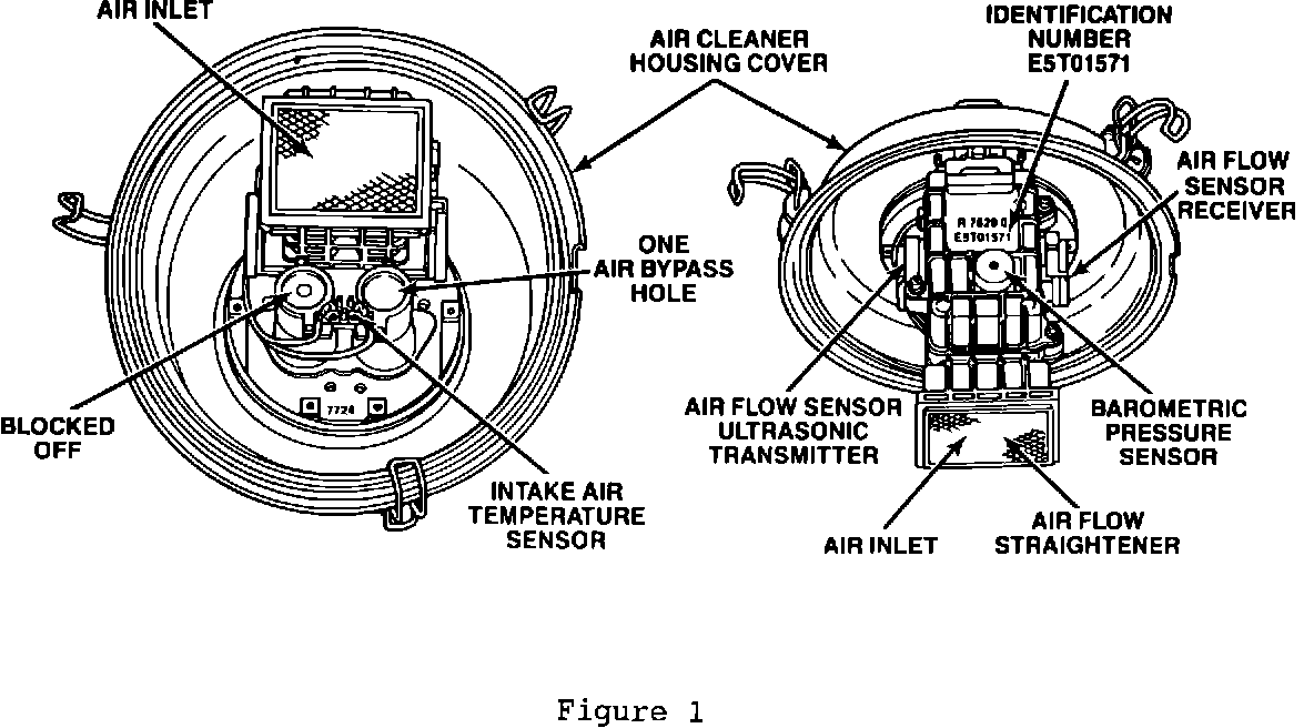 1. Confirm the air flow sensor identification number (E5T01571) as marked on the side of the-air flow sensor (Figure 1). Inspect the air passage of the sensor and verify that one of the air by-pass holes are plugged. If both of the by-pass holes are open, the air flow sensor must be replaced using the correct sensor, PN MD118125.