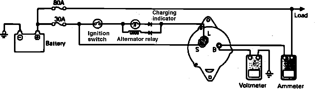 2. Disconnect wire from terminal B of alternator, then connect an ammeter between battery positive cable and alternator B terminal.