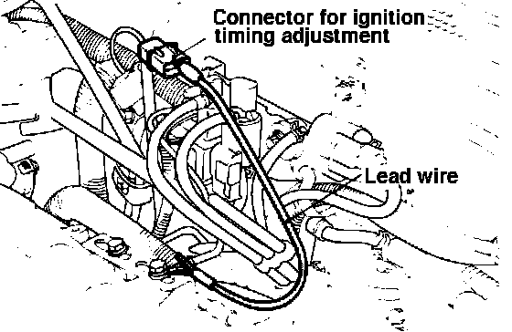 2. With the engine stopped, connect a lead wire, between the terminal for ignition timing adjustment (located in the engine compartment) and ground.