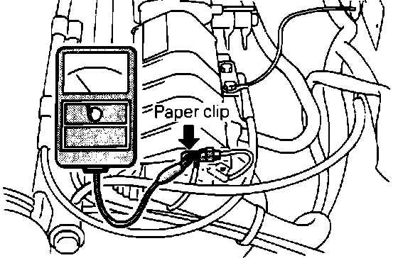 Insert a paper clip (from harness side) in the one pin connector located between the noise filter and the ignition coil, and connect the tachometer.