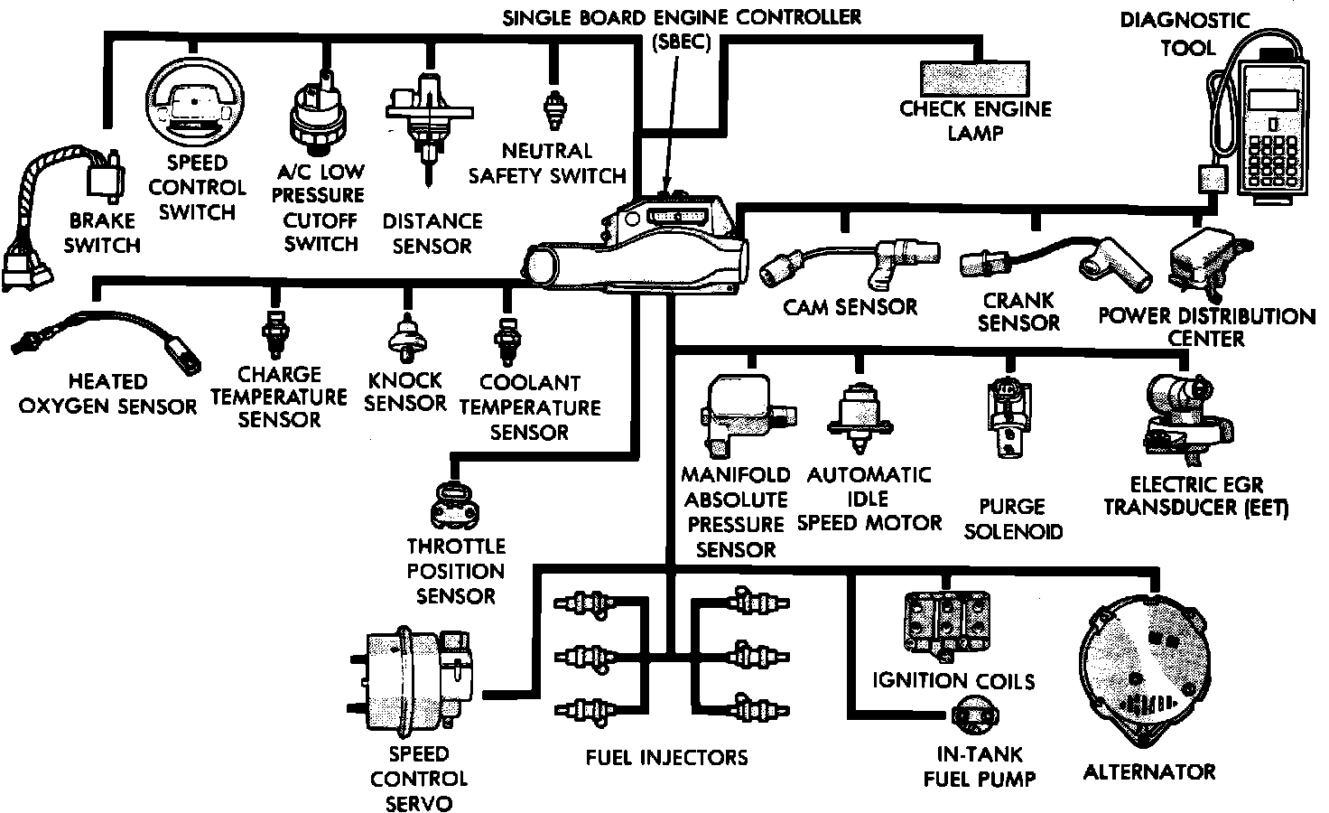 The engine systems in this vehicle are controlled by a Single Board Engine Controller (SBEC). This controller provides precise air/fuel mixture control for all driving conditions and regulates ignition timing, emission control devices, cooling fan, charging system, and idle speed. The SBEC is a digital pre-programmed computer that has the ability to update and revise its programming to meet changing operating conditions.