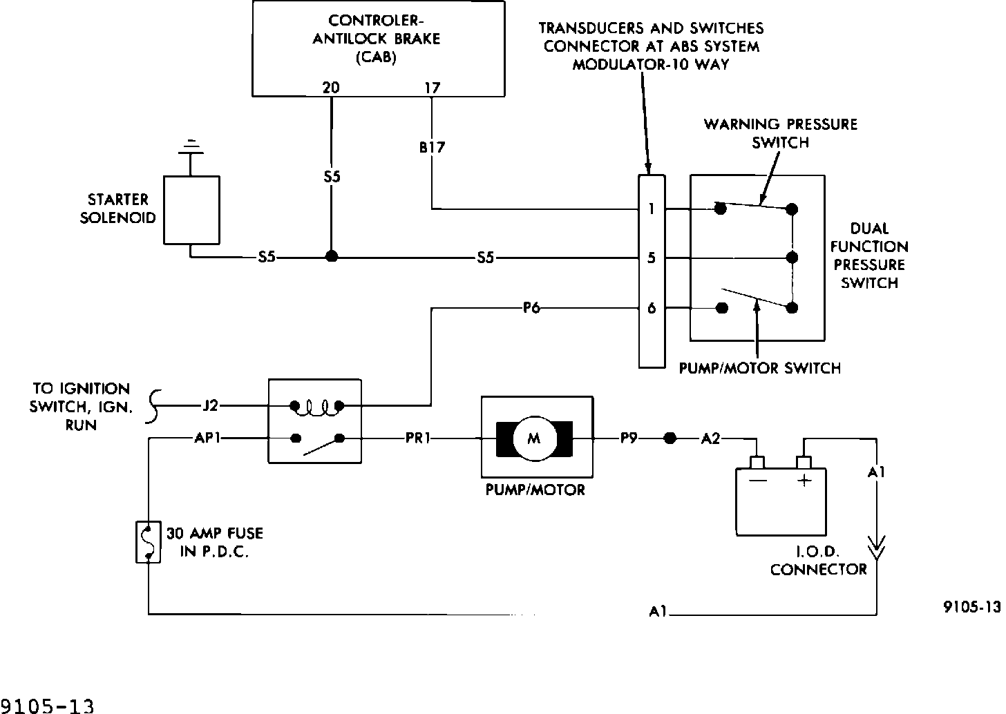 Ground for the Dual Function Pressure Switch is provided through the starter solenoid. This prevents the energizing of the pump/motor relay while the starter motor is engaged. This reduces total battery current draw during cranking.