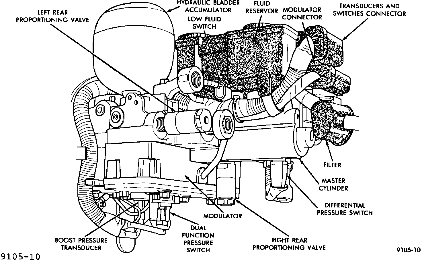 The ABS system uses screw-in proportioning valves in place of the conventional differential pressure/proportioning valves. Each rear brake circuit has its own screw-in proportioning valve which is attached to the rear brake outlet ports of the hydraulic assembly (see Fig. 2). These valves limit brake pressure to the rear brakes after a certain brake pressure is reached. This improves front to rear brake balance during normal braking.