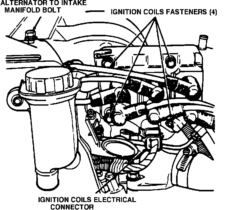 (13) Remove the 4 bolts which attach the DIS coil module to the intake plenum and the alternator bracket to intake plenum bolt (Fig. 7). Disconnect plug wires from spark plugs and remove DIS coil module with the wires attached.