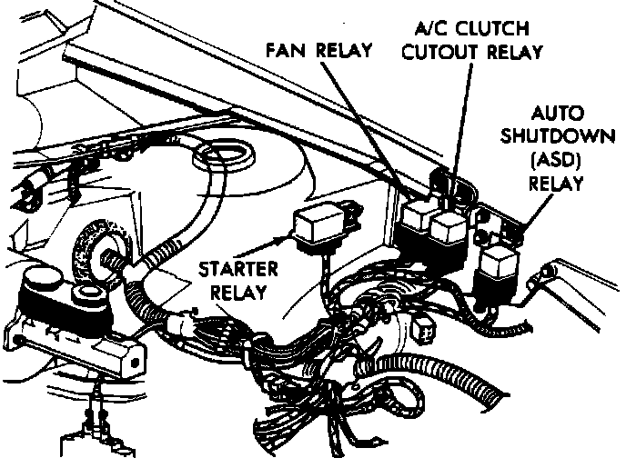 The Auto Shutdown (ASD) relay is located in the engine compartment in front of the left strut tower.