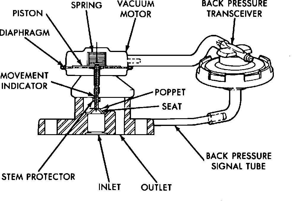 The EGR system used is a backpressure type. A backpressure transducer measures the amount of exhaust gas backpressure on the exhaust side of the EGR valve and it varies the amount of vacuum supplied to the EGR valve. The transducer uses this backpressure signal to supply the correct amount of vacuum to the EGR valve depending on engine load conditions. Vacuum is supplied to the backpressure transducer by a ported vacuum signal from the throttle body.