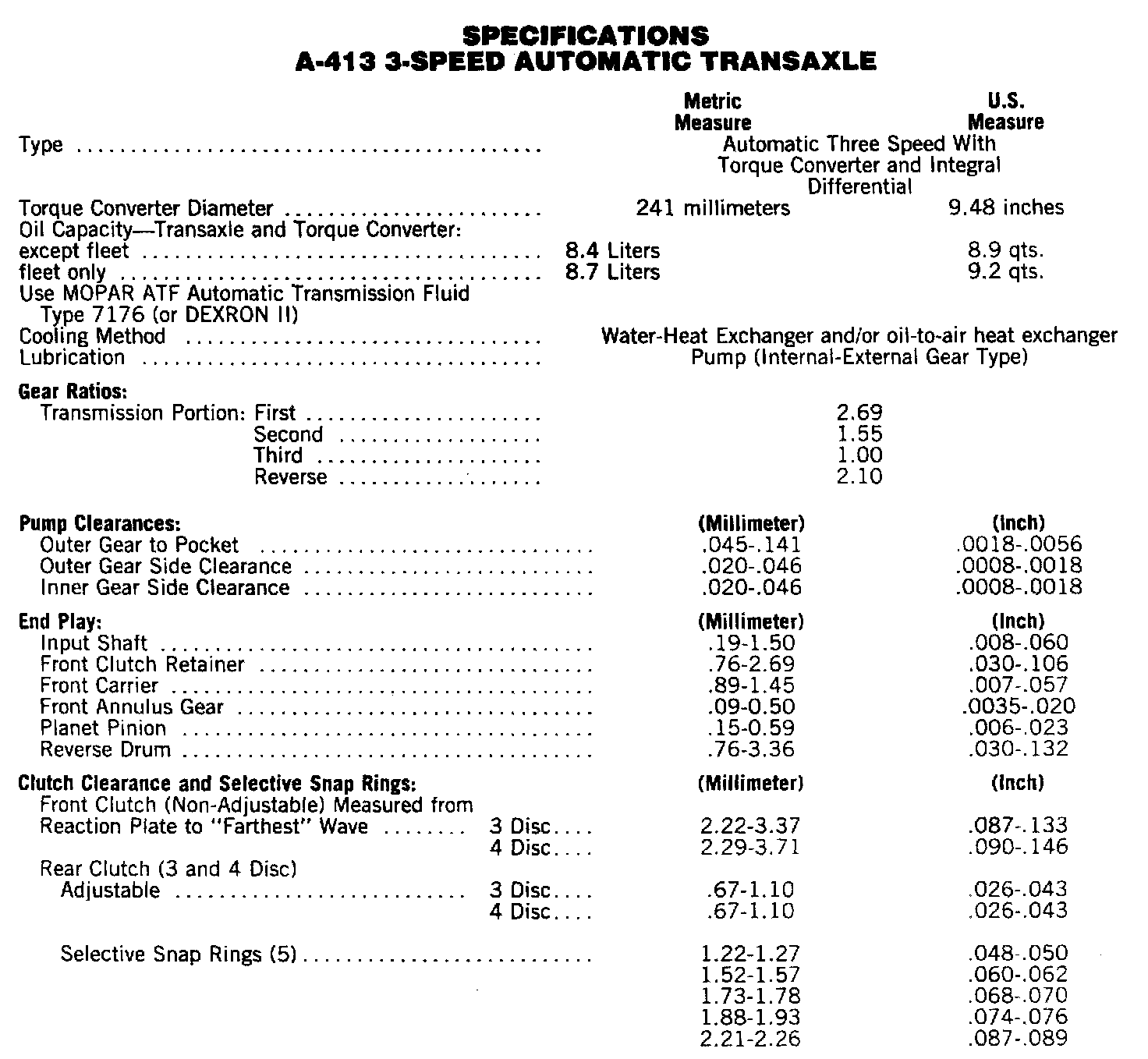 A-413 3-Speed, Specifications: