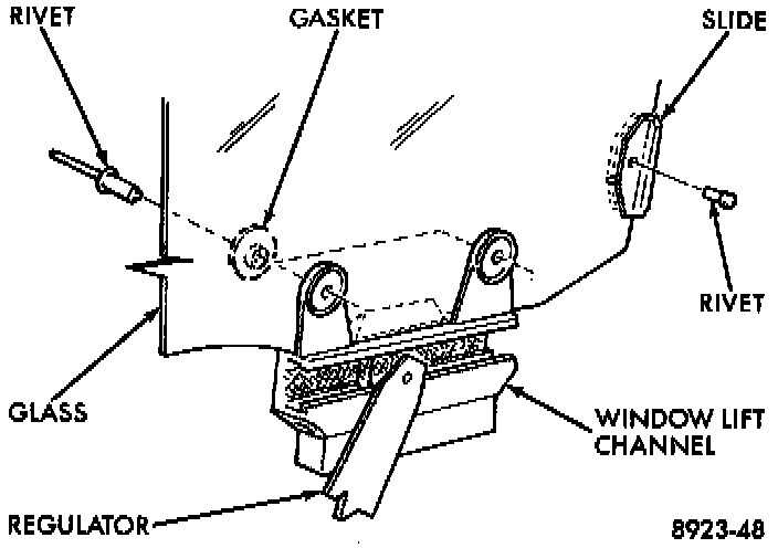 13. Drill out and replace rivet when installing the glass. The rear guide pushes back into the back channel.