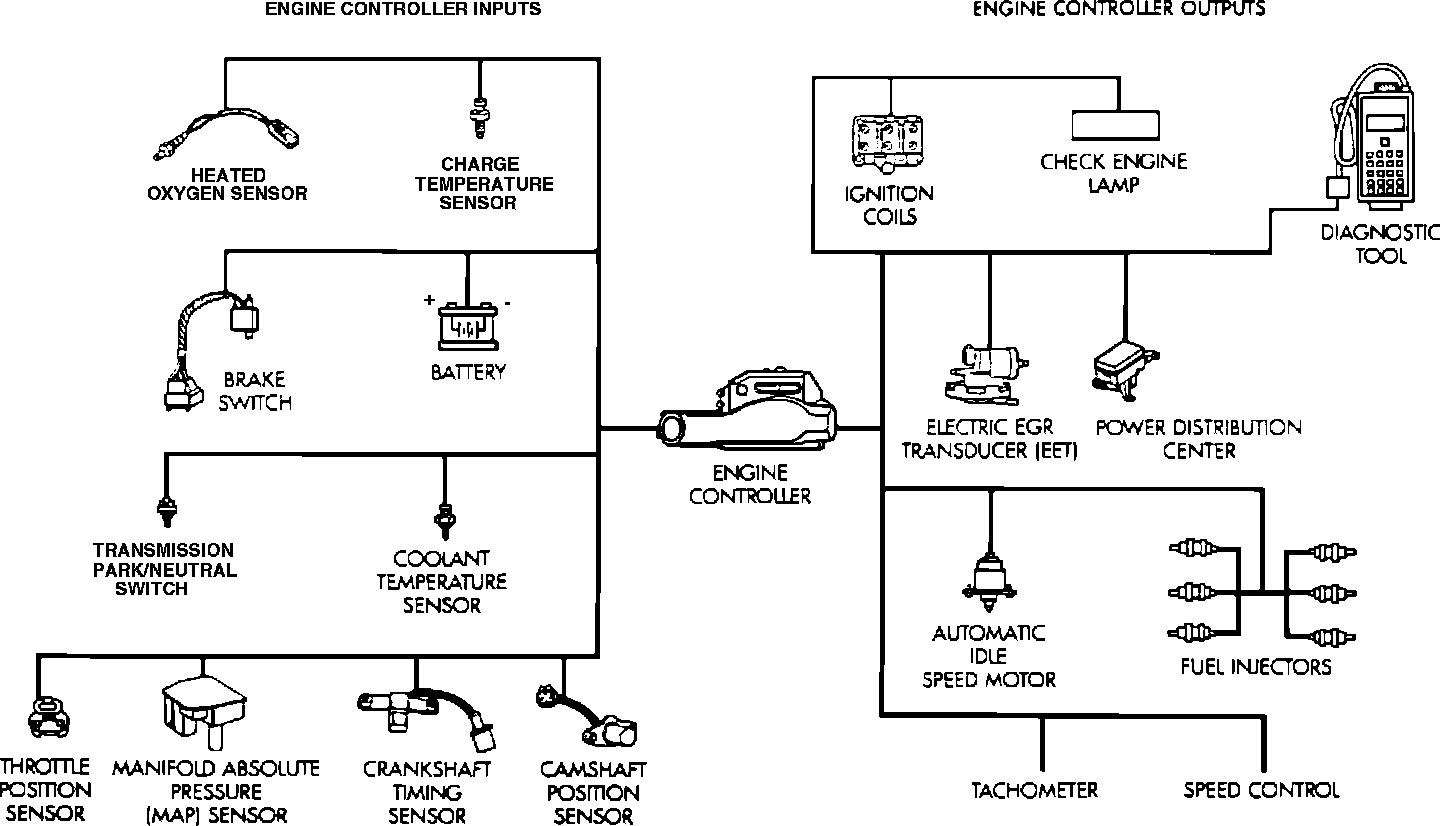 The engine systems in this vehicle are controlled by a Single Board Engine Controller II (SBEC II). This controller provides precise air/fuel mixture control for all driving conditions, and regulates ignition timing, emission control devices, cooling fan, charging system, and idle speed. The SBEC II is a digital pre-programmed computer that has the ability to update and revise its programming to meet changing operating conditions.