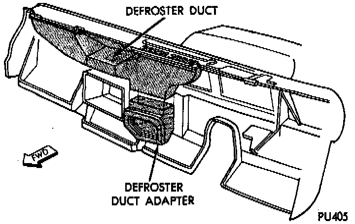 2. Separate the defroster adapter from the heater A/C unit and pull the adapter downward and out from under the instrument panel.