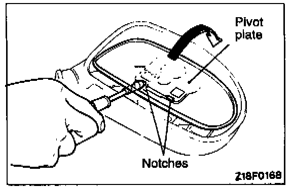 Tilt the mirror upward and fit a screwdriver blade covered with protective tape in the notch between the mirror and the pivot plate to pry up the mirror.