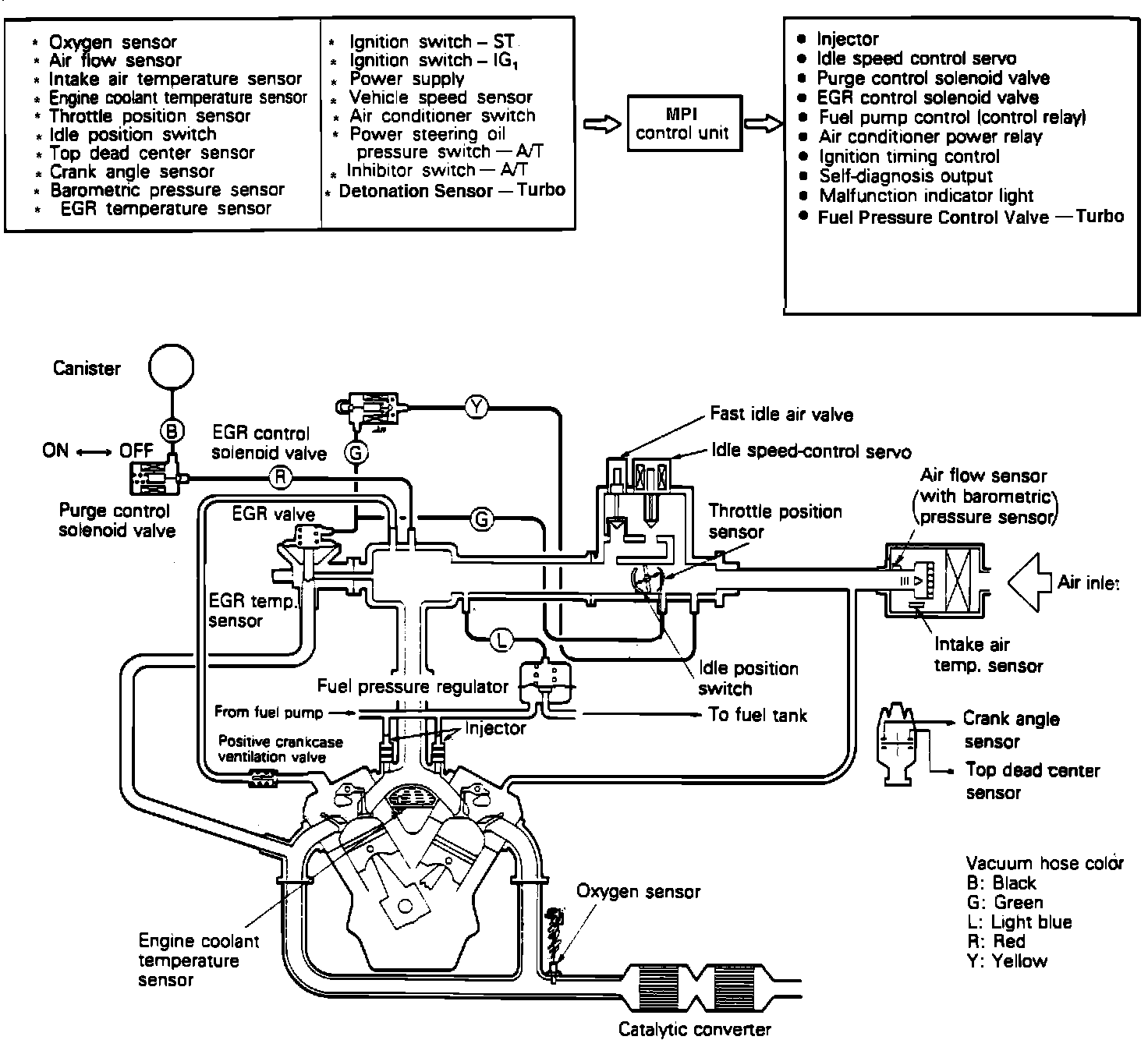 The Computerized Engine Control System is built around the electronic MPI Control Unit. The MPI Control Unit constantly monitors return signals from various sensor inputs and then responds by opening or grounding an output device circuit within the MPI Control Unit. As operating conditions change, the MPI Control Unit makes adjustments to maintain optimum performance and fuel economy.