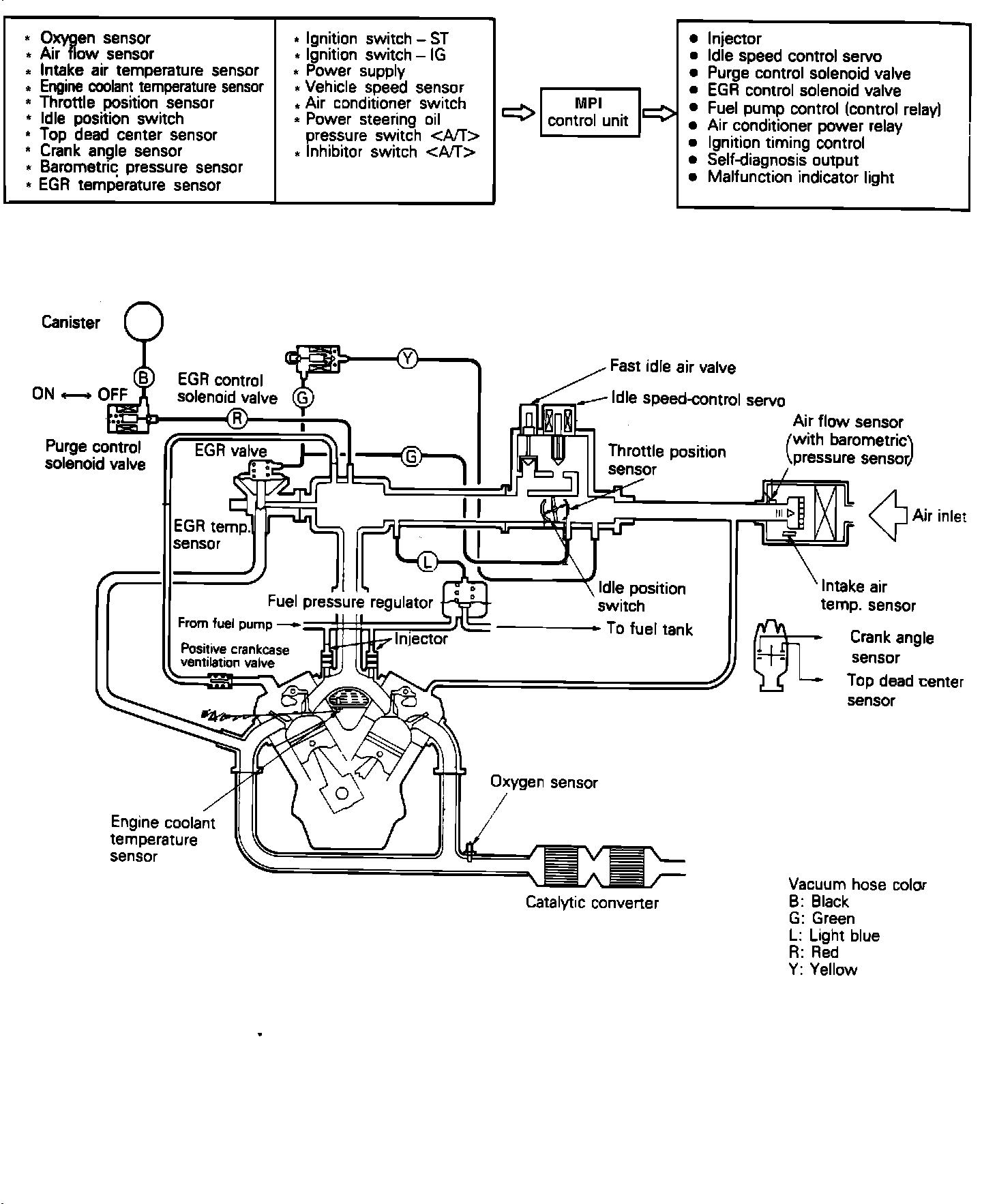 This vehicle uses an oxygen sensor to provide the MPI Control Unit with information concerning air/fuel mixture. The O2 sensor is threaded into the exhaust manifold and measures the level of oxygen within the exhaust gas. A voltage is generated and sent to the MPI Control Unit as an input signal. The MPI Control Unit reads this signal input and the return signals from the other sensors, then will either enrich or lean the air/fuel mixture.