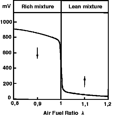 The difference in the amount of oxygen contacting the inner and outer surfaces of the oxygen sensor creates a pressure differential which results in a voltage signal being generated. The amount of voltage produced is determined by combustion efficiency.