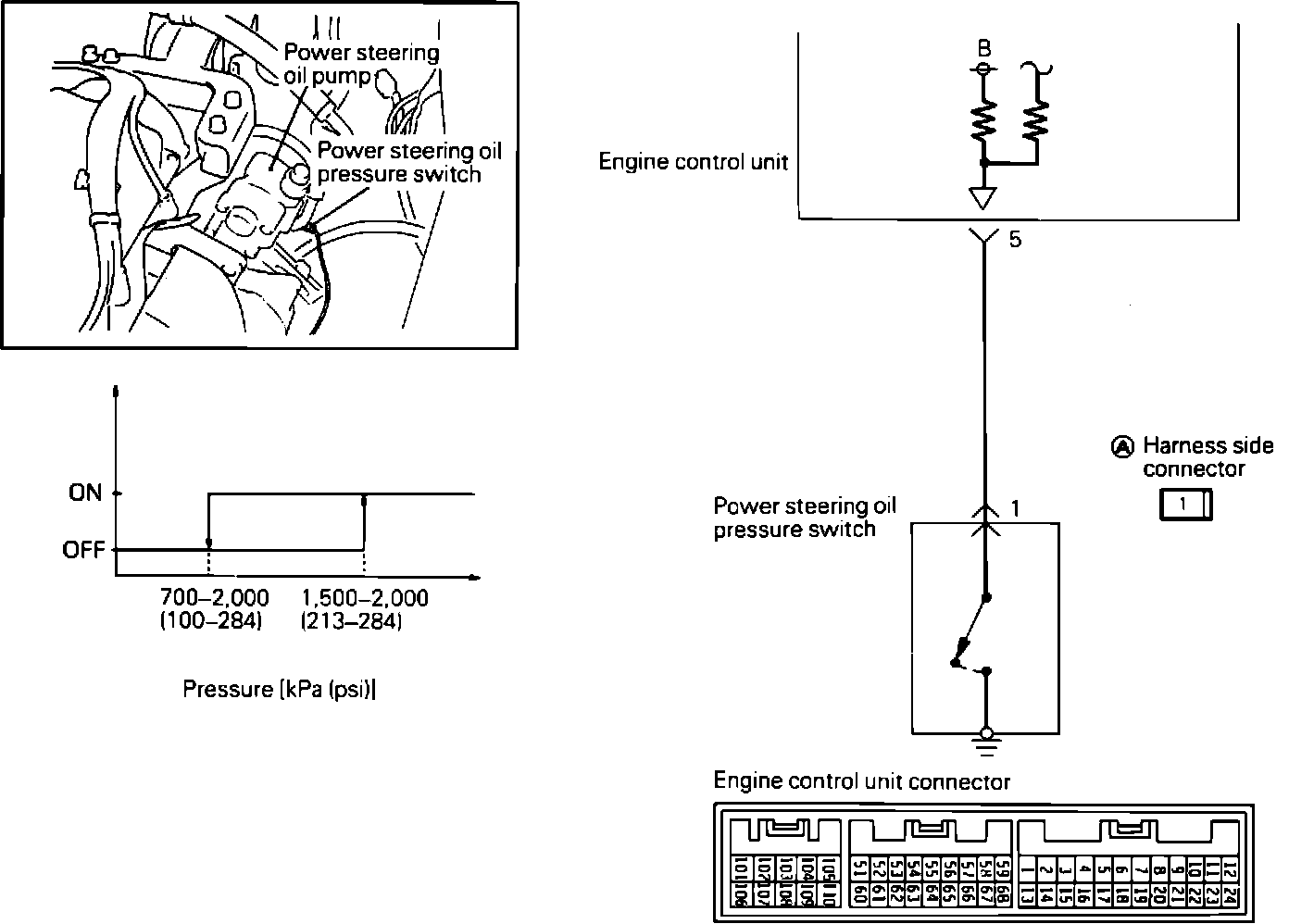 The Power Steering load switch provides a signal to the ECU when there is steering load. The ECU uses this information for idle speed control. When pump output pressure exceeds a preset level, the switch closes, completing the circuit to ground.