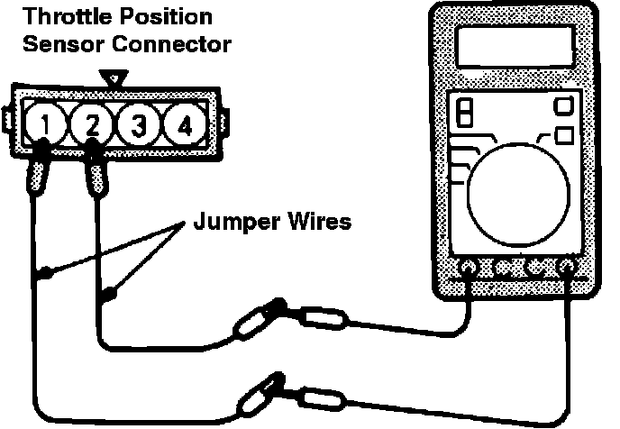 6. Slowly rotate the TPS body clockwise until the ohmmeter indicates an open circuit between terminals 1 and 2. At this point, tighten the TPS mounting bolts securely.