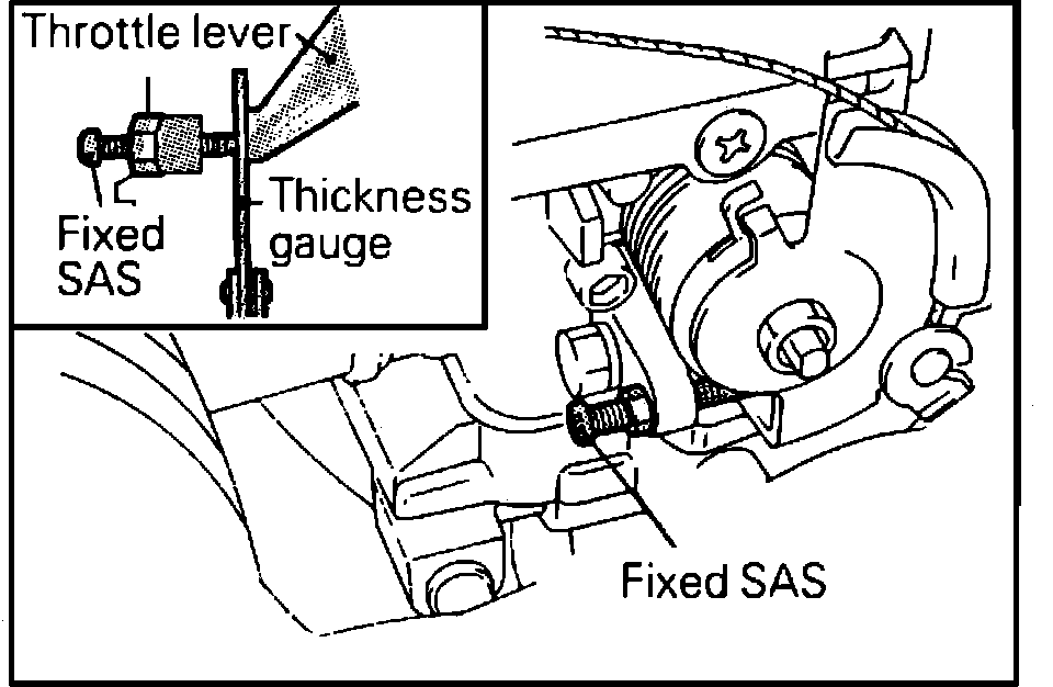 3. Insert a 0.65 mm (0.025 in) feeler gauge between the fixed Speed Adjusting Screw (SAS) and the throttle lever.