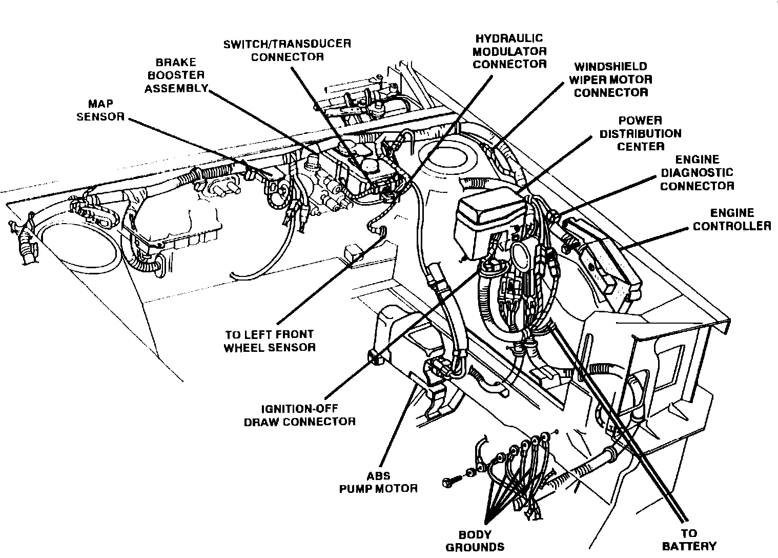 The SBEC and connector are located in the engine compartment, at the front left-hand corner behind the headlight assembly.