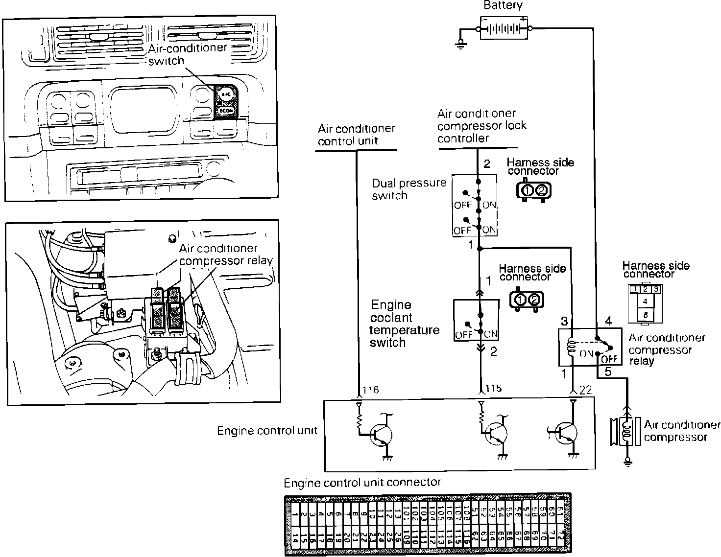 Allows the "A/C ON" signal to be transmitted to the ECU. Used to prevent engine overheating by eliminating A/C operation.