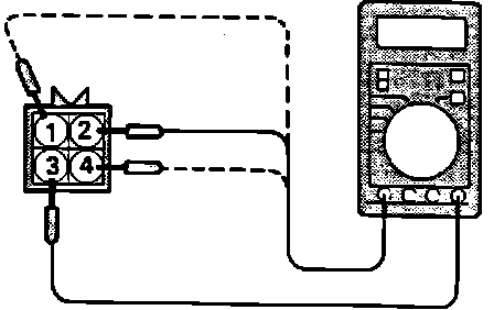 2. Using an ohmmeter, check the resistance of the primary circuits. Measure between terminals 2 and 3 for the cylinder 1 and 4 coil, terminal 1 and 3 for the cylinder 2 and 5 coil and terminal 4 and 3 for the cylinder 3 and 6 coil.
