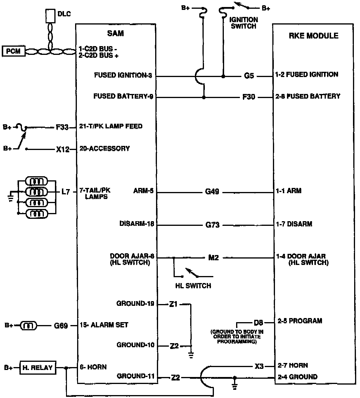 This input provides the module with voltage needed for proper ignition-off operation. The voltage also allows the module to trigger the alarm if an unauthorized entry is detected. The battery voltage on pin #21 is used as a source for the park and tail lamp output voltage. The feed is also utilized for the C2D bias voltage that will "power up" the bus if there is an unauthorized entry.