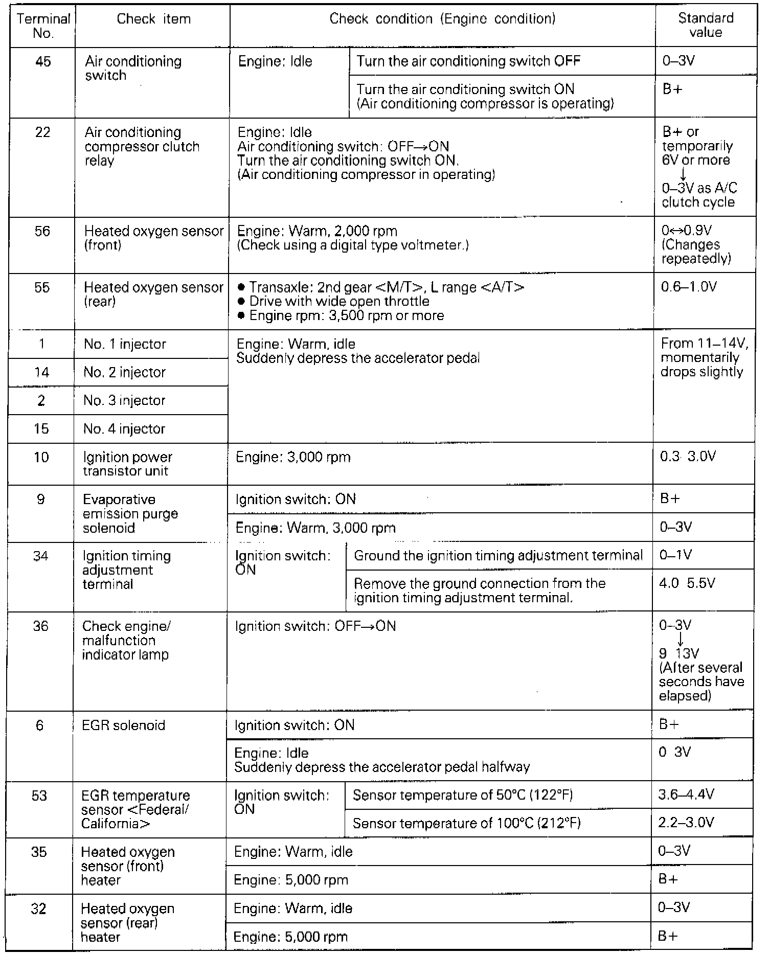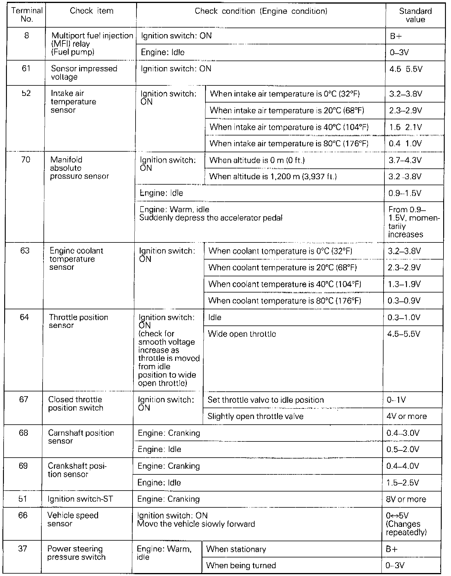 3. If voltmeter shows any deviation from standard value, check the corresponding sensor, actuator and related electrical wiring, then repair or replace.