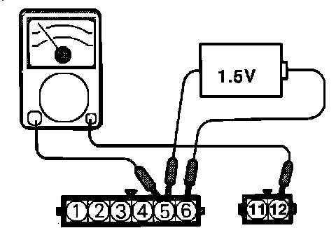 1. Connect the negative (-) terminal of the 1.5V power supply to terminal 5 of the ignition power transistor; then check whether there is continuity between terminal 5 and terminal 12 when terminal 6 and the positive (+) terminal are disconnected or connected.