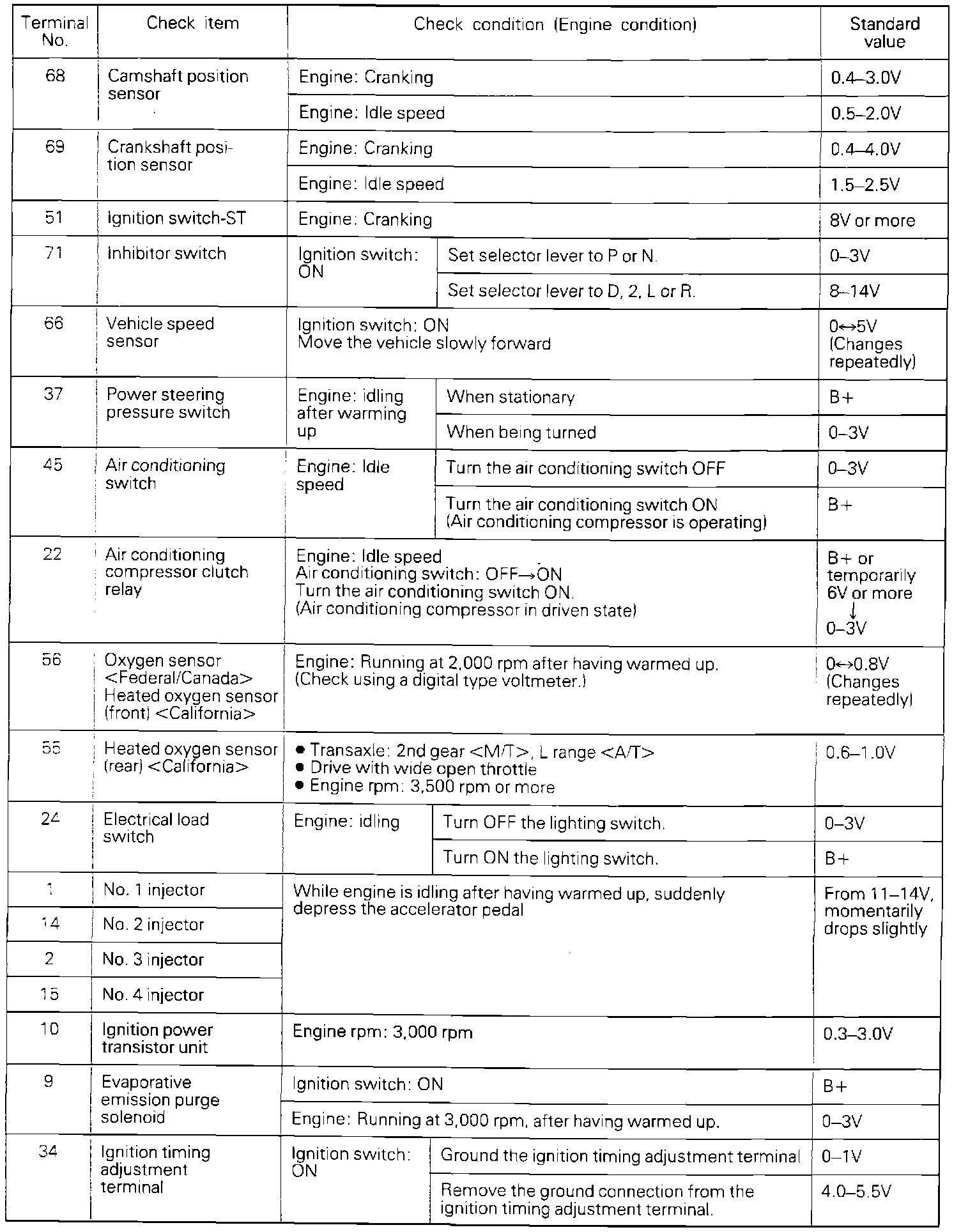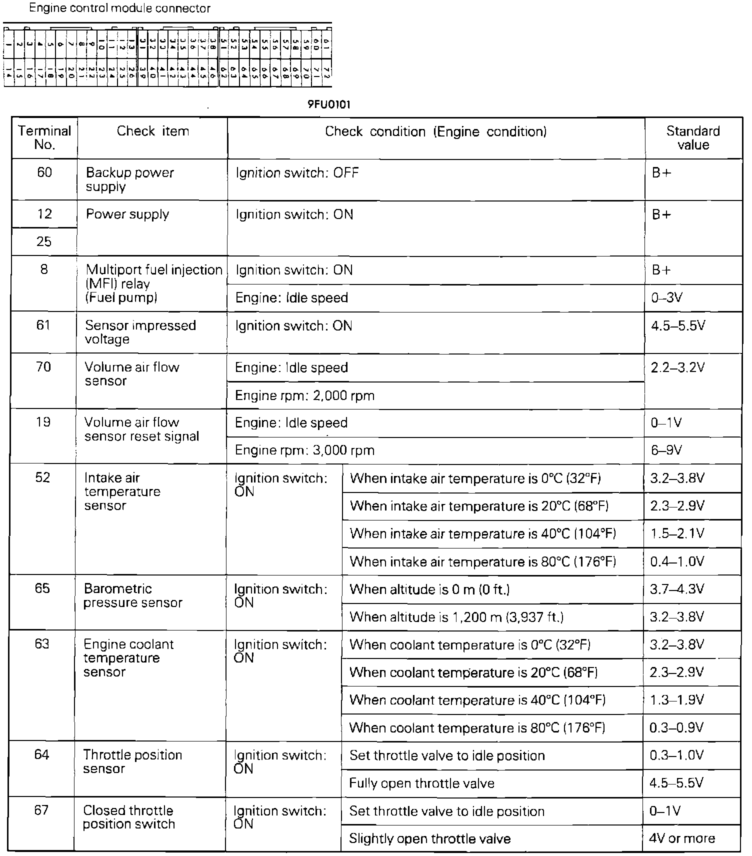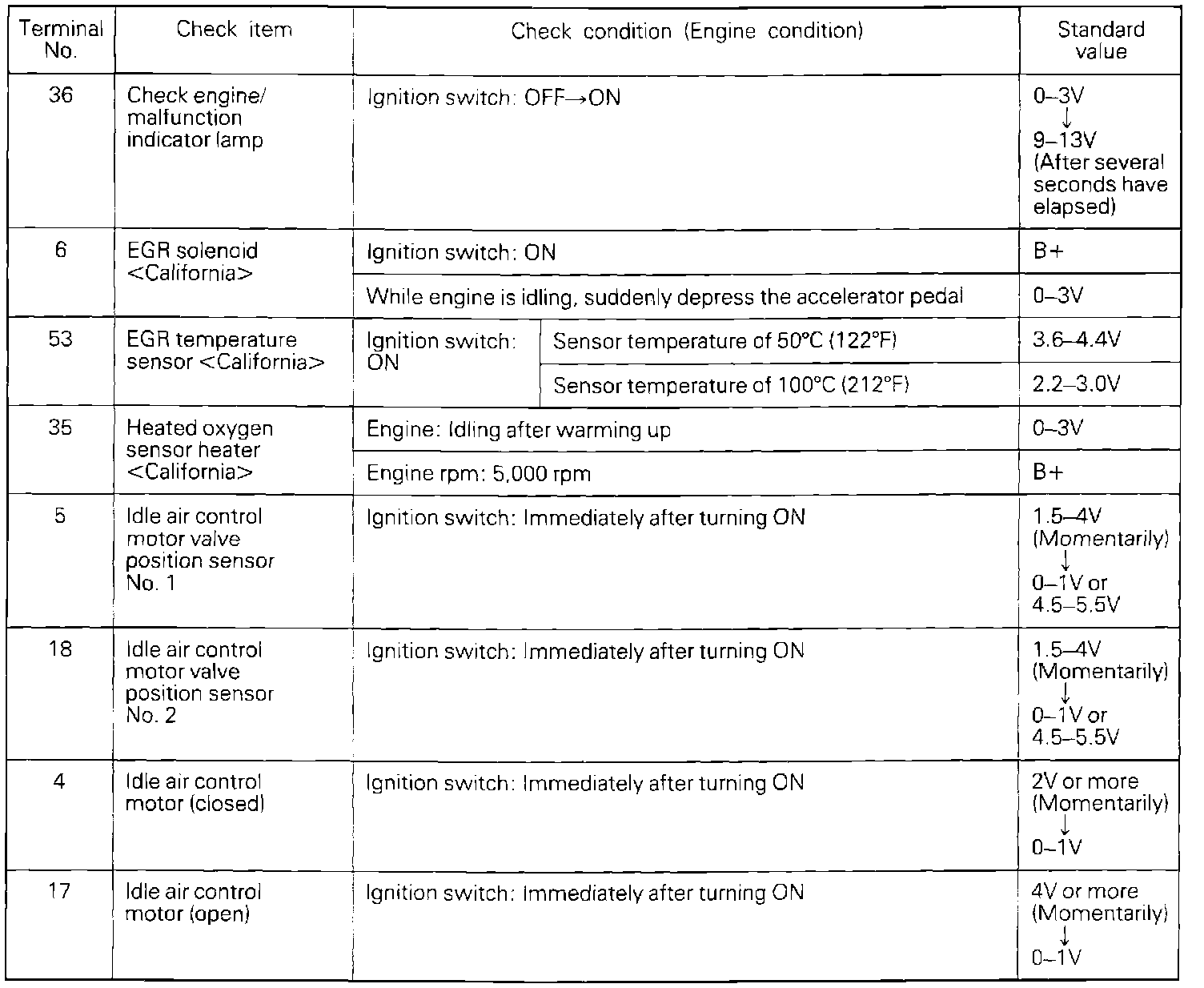 If voltage measured differs from that listed on the chart, check the corresponding sensor, actuator, or related electrical circuit. After repairs have been completed, recheck voltmeter readings to confirm that the repair has corrected the problem.