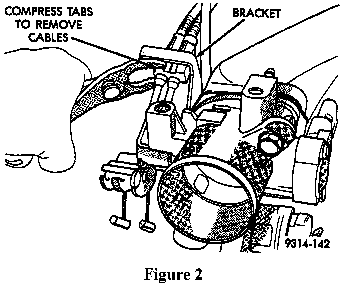 8. Remove the throttle cable and speed control cable from their mounting bracket by compressing the locking tabs (Figure 2).