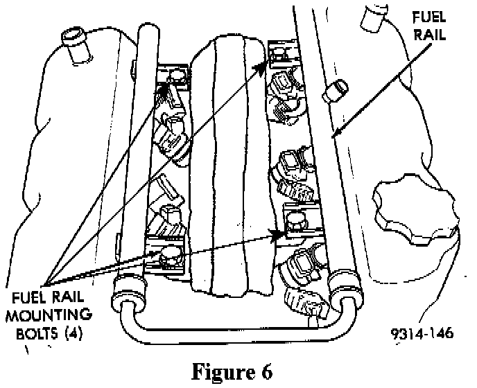 23. Remove the fuel rail mounting bolts (Figure 6). Lift the fuel rail straight up and off the engine. Cover the fuel injector openings in the intake manifold.