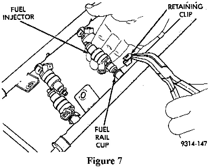 24. Remove the fuel injector retaining clips and then remove the injectors from the fuel rail cups (Figure 7).