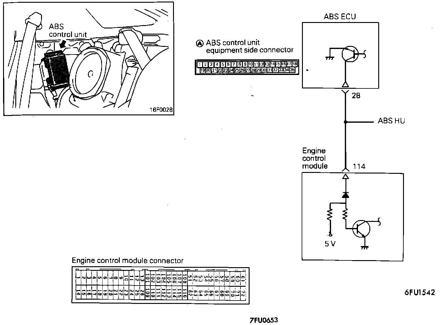 2. Check for continuity between the ABS control module terminal 28 and the Engine Control Module terminal 114.